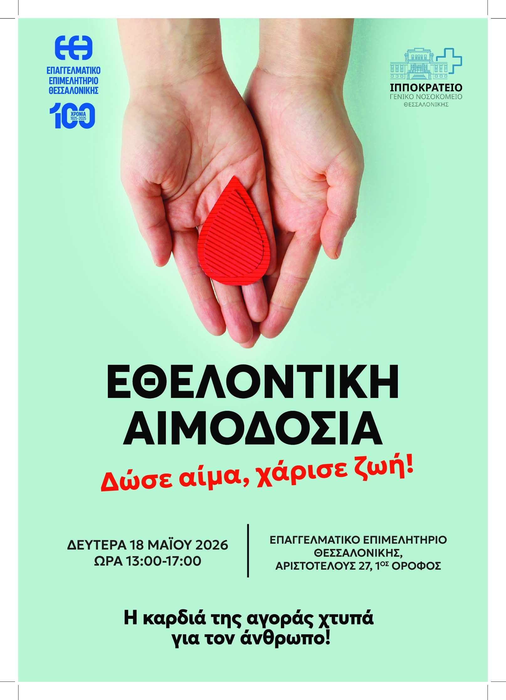 Ως εκ τούτου θα θέλαμε να σας ενημερώσουμε ότι, η δράση αιμοδοσίας με την ευγενική υποστήριξη του Ιπποκράτειου Γ.Ν.Θ. θα πραγματοποιηθεί Δευτέρα 18 Μαΐου 2026 και τις ώρες 13:00 έως 17:00, στην έδρα του Επιμελητηρίου, Αριστοτέλους 27, 1ος όροφος.