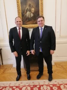 Συνάντηση με τον Υπουργό Εξωτερικών κ. Γιώργο Γεραπετρίτη είχε σήμερα ο Πρόεδρος της Κεντρικής Ένωσης Επιμελητηρίων Ελλάδας (ΚΕΕΕ) κ. Γιάννης Βουτσινάς, με αντικείμενο την ενημέρωση για τη δράση και τη θεσμική παρουσία της ΚΕΕΕ στο πλαίσιο της Ένωσης Ευρωπαϊκών Εμπορικών και Βιομηχανικών Επιμελητηρίων (Eurochambres). Η συνάντηση πραγματοποιήθηκε ενόψει της συμμετοχής της ελληνικής αντιπροσωπείας, που αποτελείται από 28 επιχειρηματίες- εκπροσώπους των επιμελητηρίων με επικεφαλής τον Πρόεδρο της ΚΕΕΕ, στο «Ευρωπαϊκό Κοινοβούλιο των Επιχειρήσεων» στις 4 Νοεμβρίου 2025, στην αίθουσα της Ολομέλειας του Ευρωπαϊκού Κοινοβουλίου, καθώς και στις εργασίες της Γενικής Συνέλευσης του Association of European Chambers of Commerce Industry (Eurochambres) στις 5 Νοεμβρίου.